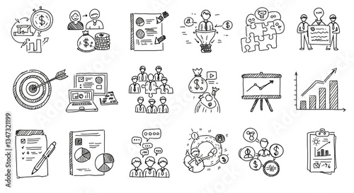 A dynamic collection of hand-drawn business icons depicting teamwork, growth, strategy, and financial success with simple line art style.