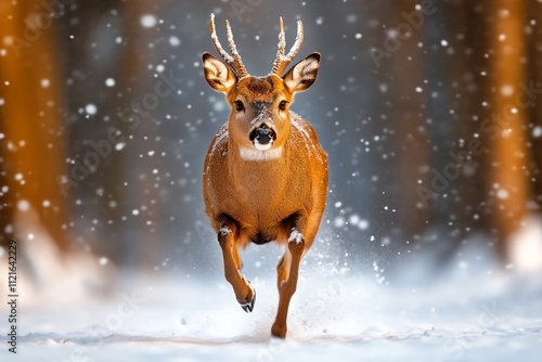 dynamic, photo, cervid, sprinting, through, snowy, landscape, flake, snow, flying, up, around, information technology