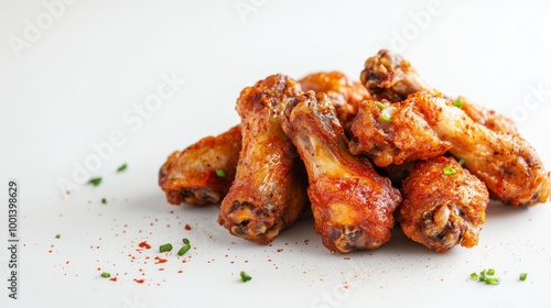 A dynamic shot of fried chicken wings with a crunchy coating, placed on a white surface with a light dusting of seasoning to highlight their flavor and texture.