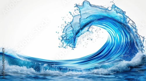 A dynamic swirl of blue water forming an elegant wave with splashes and bubbles, set against a clean white background.
