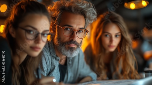 A dynamic team intently collaborating in a modern office, immersed in their creative project under warm lighting, highlighting their focus and determination on a stylish workplace.
