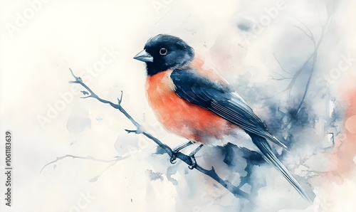 A European bullfinch perched on a white background showcasing its vibrant orange and black plumage and charming features