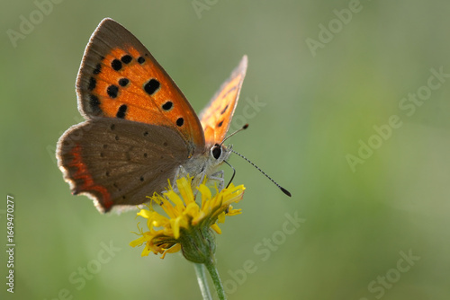 A European Common copper butterfly, Lycaena phlaeus on a yellow flower with green blurred background