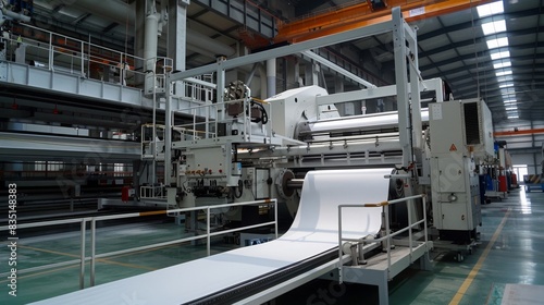 A factory with a conveyor belt of paper