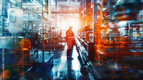 A factory worker overlaid with machinery and production lines, symbolizing the integral role of human labor in industrial manufacturing
