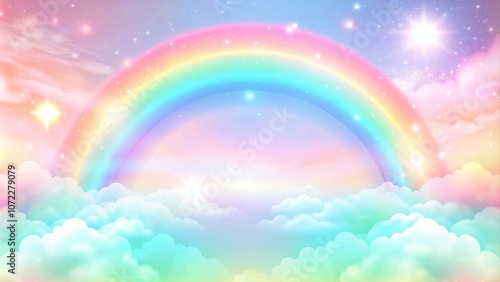 A fairy tale landscape of the sky, thick pink clouds and a colorful beautiful rainbow, gentle vivid colors. Rainbow and pink clouds fantasy rainbow background design.