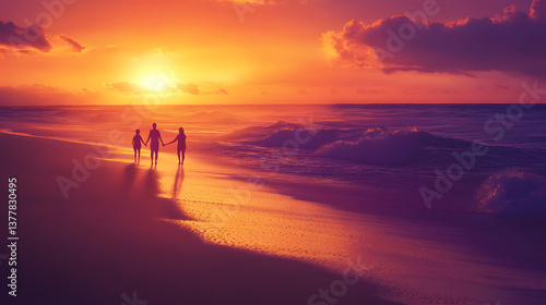 A family enjoying a serene sunset walk along the beach, capturing love and togetherness in a beautiful setting.