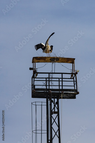 april, ukraine, bird, family, lantern, lighting, mast, nest, sky, stork, twig, wildlife