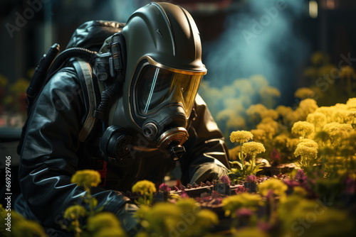 A farmer in a protective suit spraying crops with pesticides, addressing agricultural pollution and its impact on ecosystems. Generative Ai.