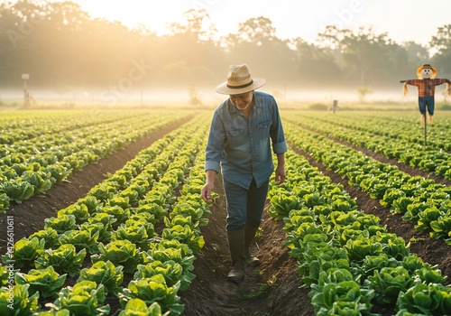 A farmer inspects his flourishing rows of leafy greens in a bright sunny field. He is wearing a straw hat and boots