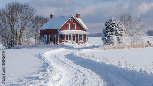 A farmhouse almost invisible beneath a heavy blanket of snow with a narrow path shoveled from the front door to the road.