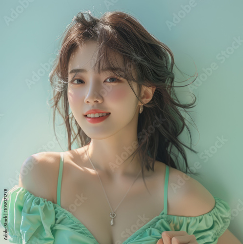 stylish, asian, girl, flawless, skin, pastel, green, youthful, charme, serene, glowing, beauty, grace, elegant, soft, chic, minimal, calming, modern, skincare, fresh, health, wellness, trendy, vibrant, pure, delicate, balance, harmony, bright, vitality, peaceful, natural, refreshing, clear, sleek, healthy, cheerful, feminine, allure, glow, clean, calmness, radiant, charming, model, calm, gentle, smooth