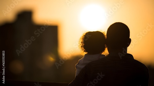 A father and daughter sharing a tender moment in silhouette against a breathtaking sunset.