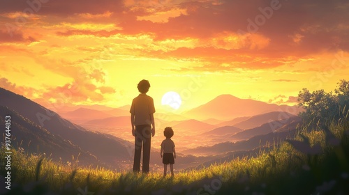 sunset, mountain, sky, cloud, father, son, silhouette, landscape, nature, grass, hill, horizon, family, love, hope, peace, calm, gold, warm, light, view, beautiful, scenic, peaceful, calmness, journey, together, bonding, adventure, travel, wilderness, majestic, vibrant, serenity