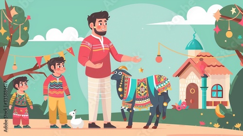 A father explaining the significance of Qurban to his children, standing next to a decorated goat, with the family home adorned for Eid in the background.