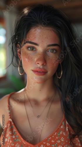 A female character in a peach-colored top with freckles, expressive eyes and plump lips.