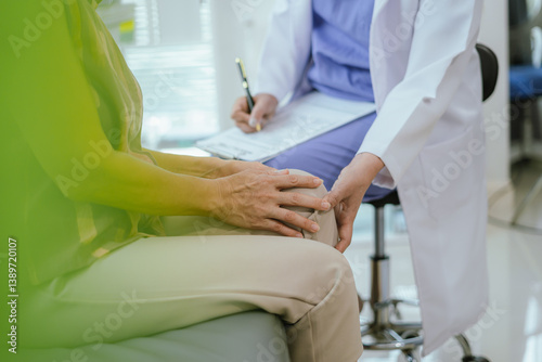 A female doctor examines an elderly patient with knee pain due to arthritis. The patient is being assisted in recovery, focusing on pain management and improving mobility.