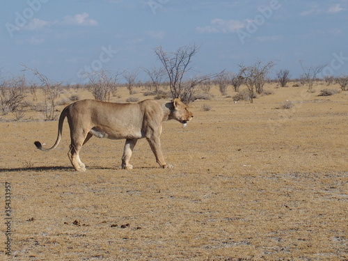 A female lion walking on a savannah, Etosha, Namibia