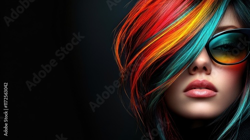 A female model with an abstract avant-garde hairstyle in bright colors looking at the camera on a simple black background.