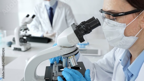 A female scientist in a blue mask and gloves is using a microscope and conducting scientific research in a sterile laboratory while a colleague is working in the background. Medicine, healthcare and