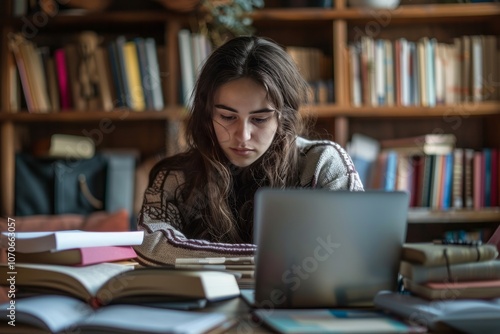 A Female Student Studying at a Desk with Books and Laptop. AI generative