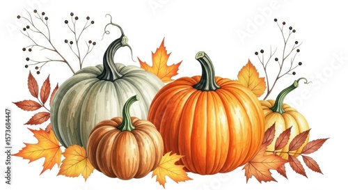 pumpkin, autumn, leaf, fall, harvest, decoration, orange, white, seasonal, thanksgiving, berry, tree branch, foliage, watercolor, festive, celebration, still, life, arrangement, decorative