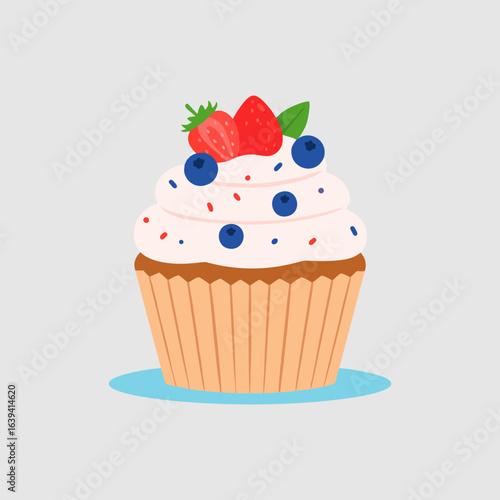 A festive berry cupcake with creamy frosting, topped with fresh strawberries and blueberries. A delicious dessert for a party or holiday celebration.
