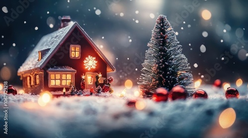 A festive Christmas greeting background with a joyful house, pine tree, snowflakes, and Christmas decorations, evoking warmth and happiness for the holiday season