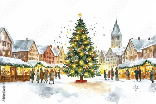 A festive Christmas market scene with a beautifully decorated tree, snow-covered ground, and charming stalls in a scenic winter setting.