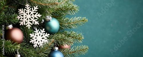 A festive Christmas tree adorned with colorful ornaments and snowflakes against a green background, perfect for holiday themes.