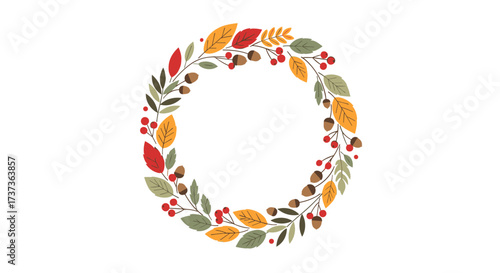 autumn, fall, chaplet, circle, decoration, seasonal, leaf, foliage, acorn, berry, nature, harvest, design, graphic, illustration, ornament, element, border, frame, celebration, festive, welcome, autumn, countryside, rustic, traditional, organic, botanical, creative, hand-drawn, digital artwork, artistic, holiday
