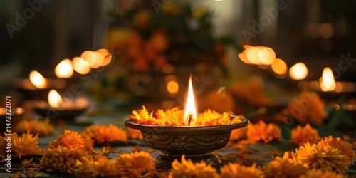 illumination, dark, room, festival, flower, candle, indian, decoration, celebration, holiday, wooden, table, lighting, decoration, floral, arrangement, light, festive, lit, marigold