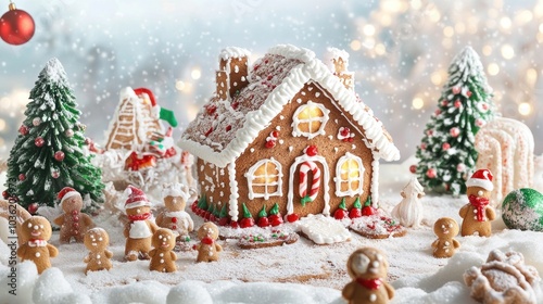 A festive gingerbread house scene adorned with snow, candies, and holiday decorations.