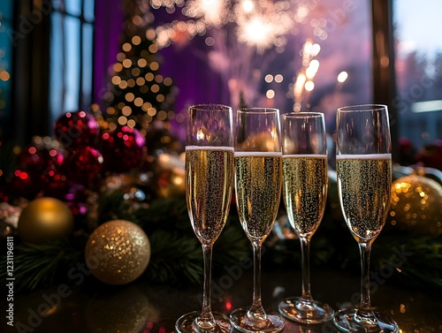 "A festive New Year's Eve celebration with champagne glasses, fireworks in the background, and party decor