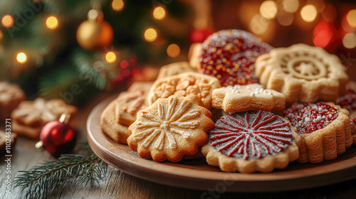 A festive plate of assorted cookies, perfect for Christmas celebrations. A variety of intricate designs with a holiday tree in the background