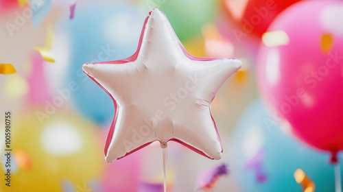 A festive star-shaped balloon surrounded by colorful balloons and confetti.