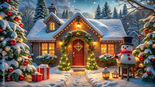 A festive winter scene with a cozy cottage adorned with twinkling lights, a snowman standing proudly, and a snowy path leading to the warm glow of the front door.