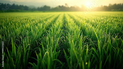 rice, field, green, plant, sun, tree, background, sunny, day, agriculture, rural, landscape, nature, horizon, sky, crop, farm, cultivation, outdoors, countryside, grass, growth, harvest, plantation, scenery, tranquil, vista, fresh, environment, rural scene, farming, sunlight, morning, asia, southeast asia, greenery, country, peaceful, calm, serene, vibrant