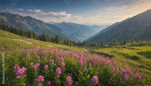 mountain, vale, sunset, wildflower, pink, flower, bloom, field, green, tree, landscape, nature, scenery, sky, cloud, summer, afternoon, light, soft, glow, picturesque, verdant, slope, lush, greenery, meadow, scenic, beauty, natural, peaceful, serene, majestic, mountain, range, alpine, forest, vista, panorama, wilderness, calmness, serenity, view, wildflower, scene