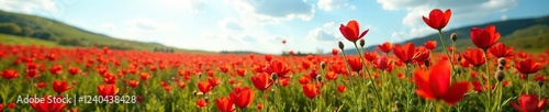 A field of Red Turk's cap flowers in full bloom under a sunny sky, flowers, bloom