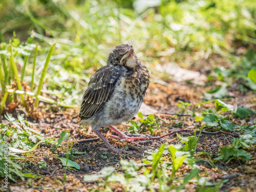 A fieldfare chick, Turdus pilaris, has left the nest and sitting on the spring lawn. A fieldfare chick sits on the ground and waits for food from its parents.
