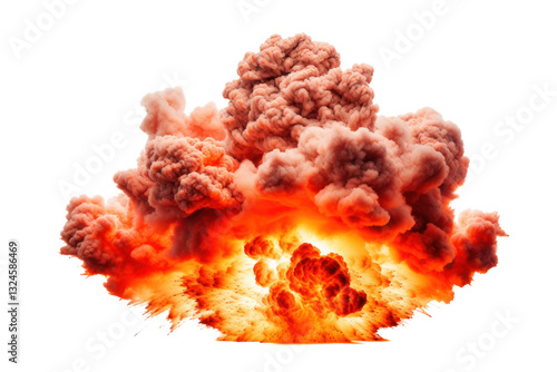 A fierce explosion with burning flames and thick smoke plumes rising high into the air isolated on white background
