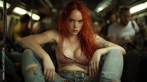 woman, fierce, subway, tattoo, assertive, determination, resilience, personal, expression, assertiveness, redhead, individuality, power, modern, urban, style, strong, beauty, grit, transport, intensity, jean, arm, passenger, commute, freckle, art, realism, passion, resilient, journey, cool, vibrant, confidence, natural, warmth, grounded