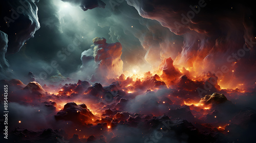 apocalypse, fiery, volcanic, glowing, ember, smoke, cloud, heat, destruction, landscape, mountain, peak, lava, magma, hell, inferno, devastation, fire, burning, red, orange, black, dark, dramatic, intense, surreal, fantasy, science fiction, art, illustration, digital artwork, abstract, texture, background, wallpaper, environment