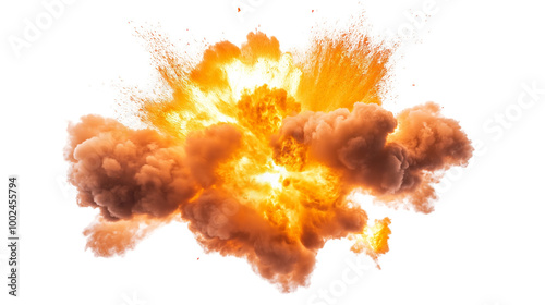 A fiery explosion with a dense, billowing smoke cloud. The explosion emits a bright, intense orange and yellow glow, illuminating the surrounding area. The smoke appears thick and voluminous
