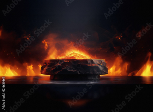 abstract, ambient, artistic, atmosphere, background, footed, bowl, burning, composition, container, contrast, dark, dark background, design, digital artwork, dramatic, ember, energy, fiery, fire, flames, glowing, heat, hot, illuminated, illustration, image, intense, lava, light, magma, moody, mountain, mysterious, orange, paper, peak, platform, power, powerful, red, rocky, rough, scene, setting, shadow, smoke, stone