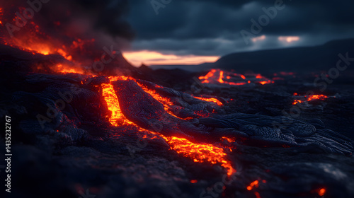 fiery, red, lava, flow, night, darkness, lighting, glow, molten, orange, terrain, rock, high-coloured, eruption, glowing, heat, nature, landscape, flowing, rugged