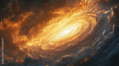 A fiery spiral galaxy, swirling in cosmic clouds.