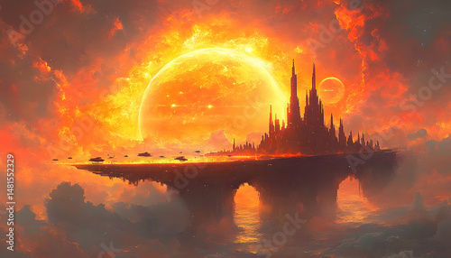 fiery, sunset, floating, city, towering, structure, vehicle, platform, cloud, sea, landscape, fantasy, artwork, digital, painting, illustration, art, majestic, mysterious, epic, dramatic, vibrant, colourful, orange, red, yellow, sky, horizon, architecture, futuristic, science fiction, imaginary, surreal, dreamlike, alien, earth, scene, view, image, picture, graphic, design, concept, aesthetic, visual, composition, element, atmosphere