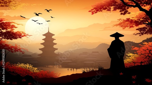 silhouette, chinese, hat, sunset, landscape, dusk, culture, illustration, profile, tradition, scenery, twilight, design, artistry, horizon, imagery, minimalist, shadow, figure, graphic, contour, colours, style, people, creative, outdoors, environment, peaceful, nature, atmospheric, beauty, optical, identity, expression, portrait, evening, tranquil, aesthetic, serene, iconic